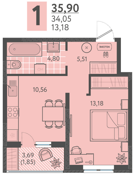 | 1 | 35.90 / 13.18 м² | от 4 308 000 руб. (120 000 руб./м²) | Планировка | |
