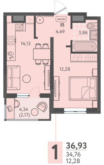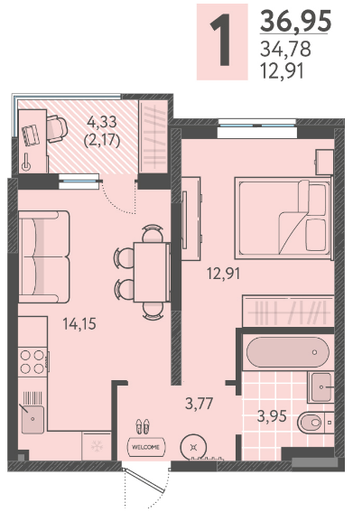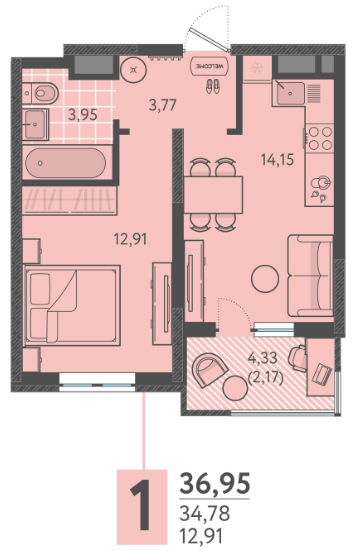 | 1 | 36.95 / 12.91 м² | от 4 501 800 руб. (121 835 руб./м²) | Планировка | |