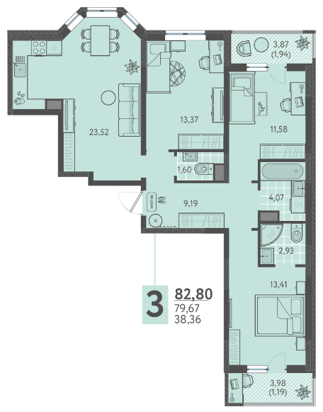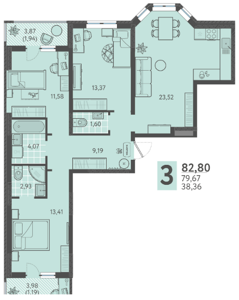 | 3 | 82.80 / 38.36 м² | от 9 131 400 руб. (110 283 руб./м²) | Планировка |