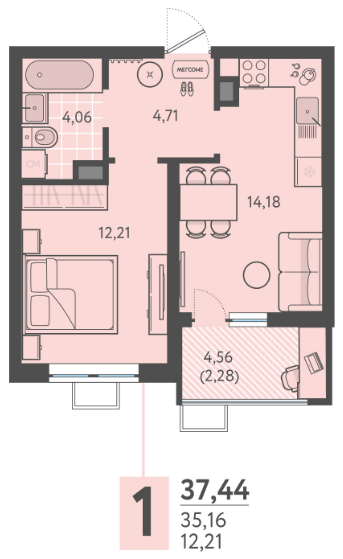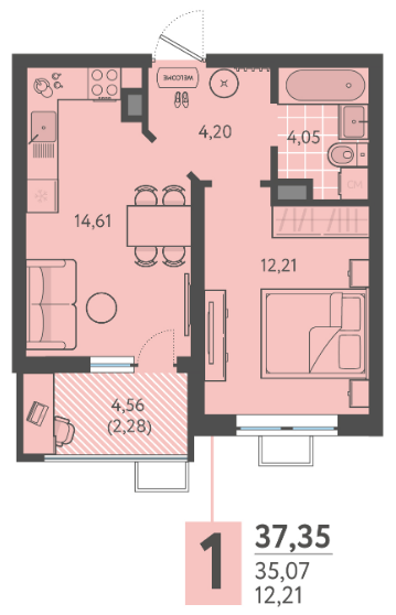 | 1 | 37.35 / 12.21 м² | от 4 482 000 руб. (120 000 руб./м²) | Планировка | |