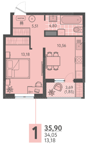 | 1 | 35.9 / 13.18 м² | от 4 128 500 руб. (115 000 руб./м²) | Планировка | |