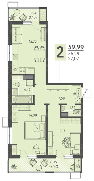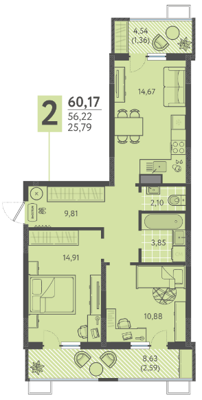 | 2 | 60.17 / 25.79 м² | от 8 905 160 руб. (148 000 руб./м²) | Планировка | |