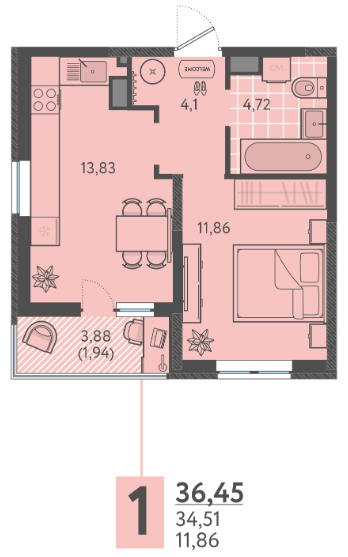 | 1 | 36.45 / 11.86 м² | от 4 191 750 руб. (115 000 руб./м²) | Планировка | |