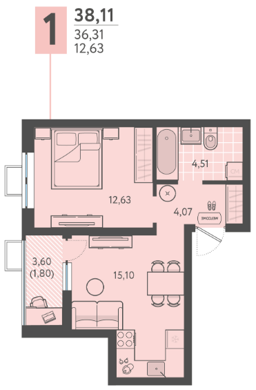 | 1 | 38.11 / 12.63 м² | от 4 496 980 руб. (118 000 руб./м²) | Планировка | |