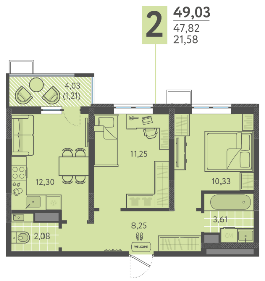 | 2 | 49.03 / 21.58 м² | от 7 256 440 руб. (148 000 руб./м²) | Планировка | |