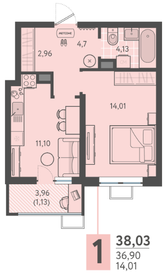 | 1 | 38.03 / 14.01 м² | от 4 487 540 руб. (118 000 руб./м²) | Планировка | |