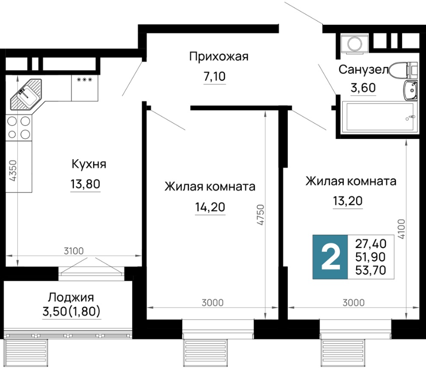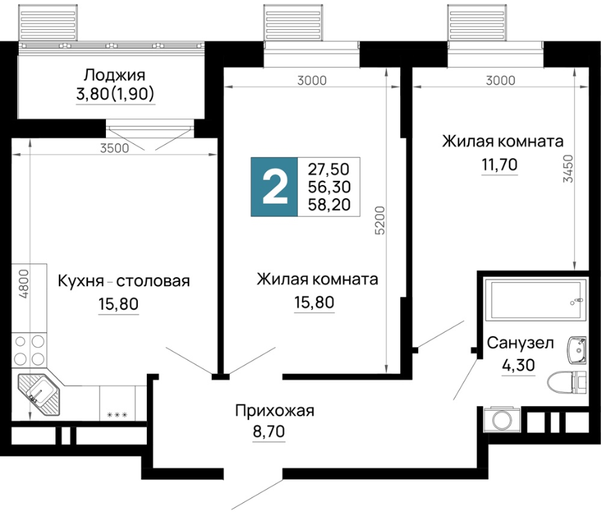 | 2 | 58.20 / 27.50 м² | от 7 566 000 руб. (130 000 руб./м²) | Планировка | |