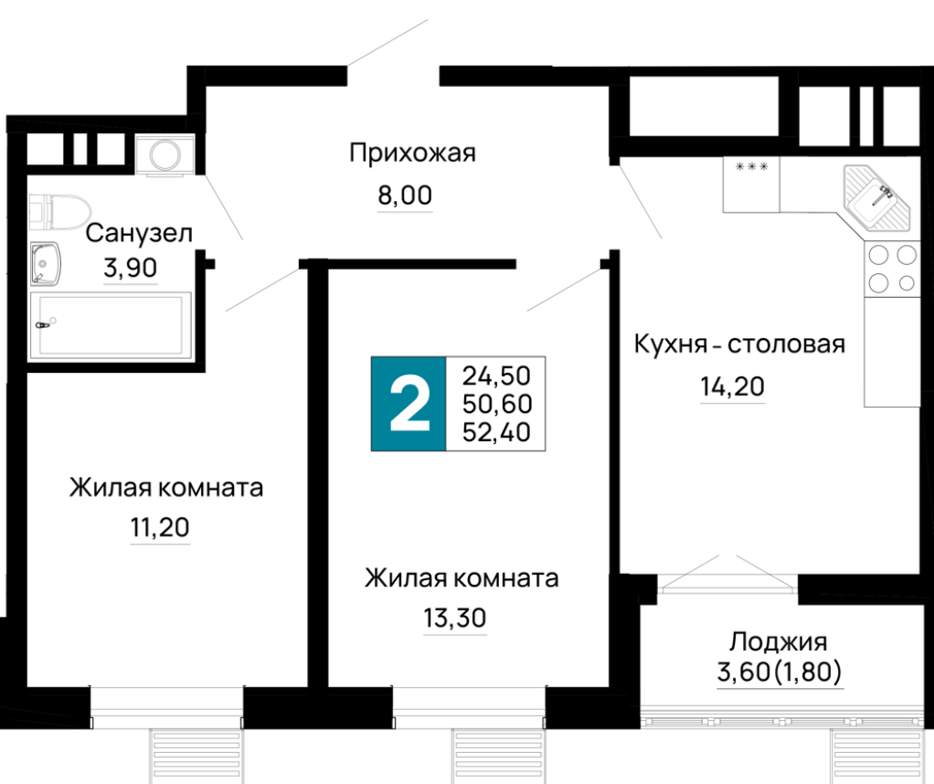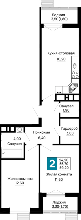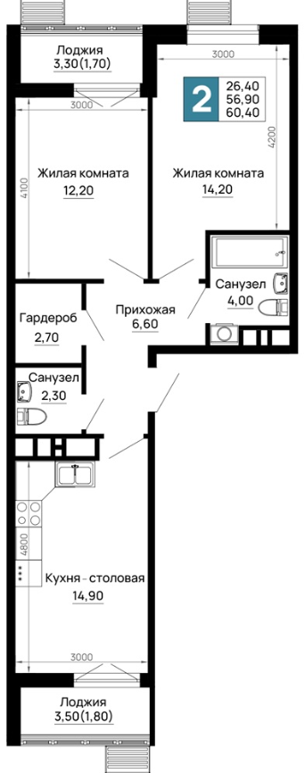 | 2 | 60.4 / 26.4 м² | от 7 550 000 руб. (125 000 руб./м²) | Планировка |