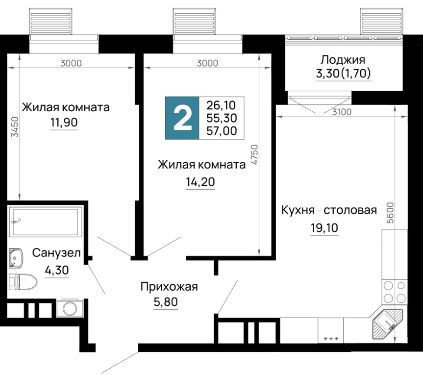 | 2 | 57.0 / 26.1 м² | от 7 410 000 руб. (130 000 руб./м²) | Планировка | |