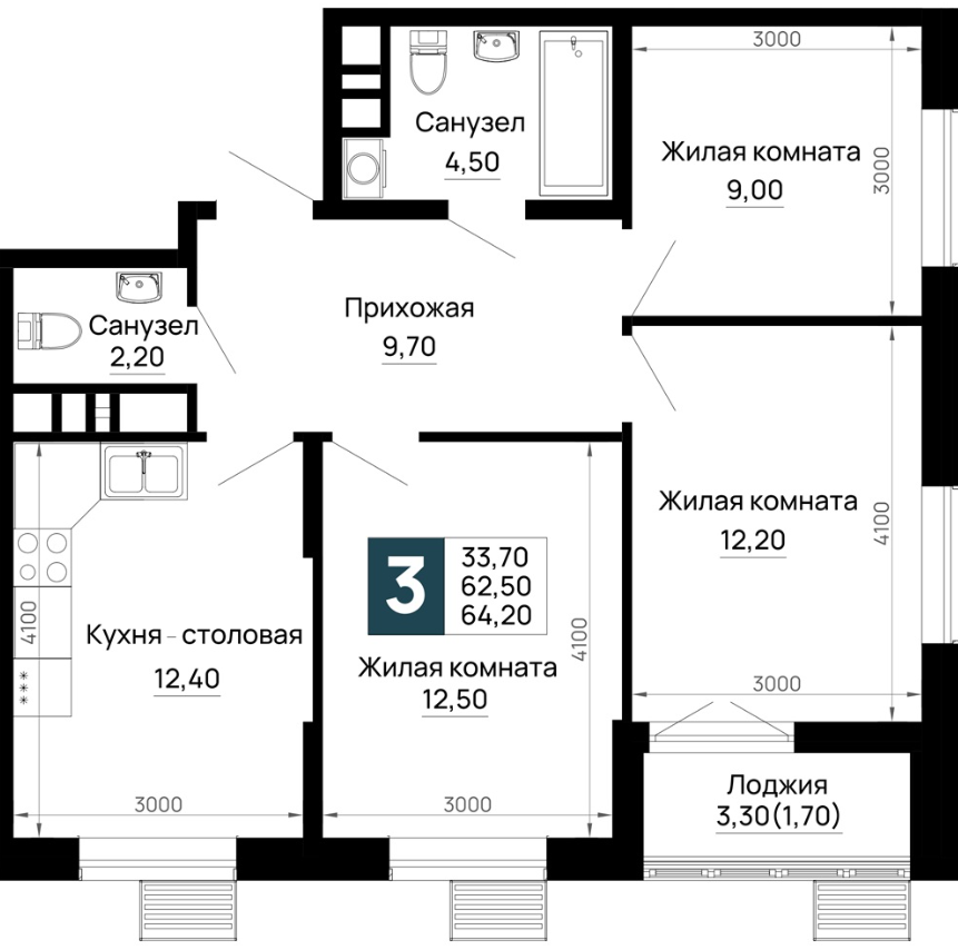 | 3 | 64.2 / 33.7 м² | от 8 025 000 руб. (125 000 руб./м²) | Планировка | |