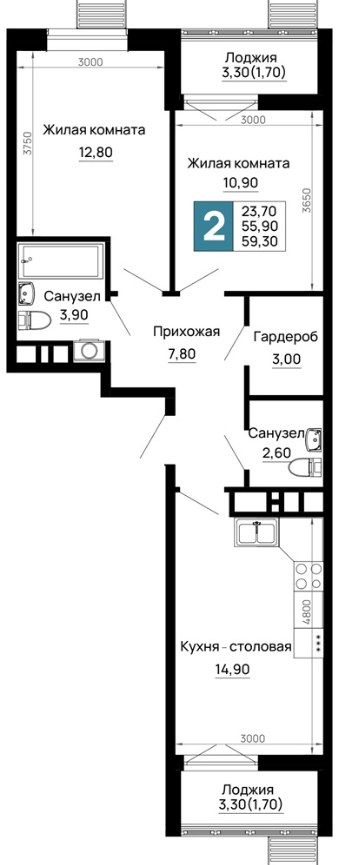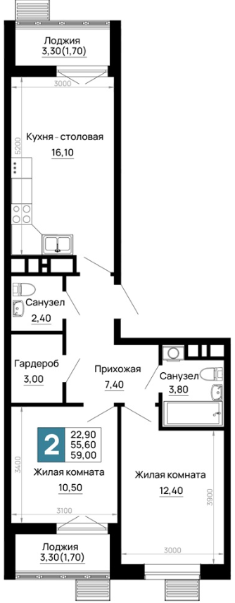 | 2 | 55.8 / 27.5 м² | от 6 975 000 руб. (125 000 руб./м²) | Планировка | |