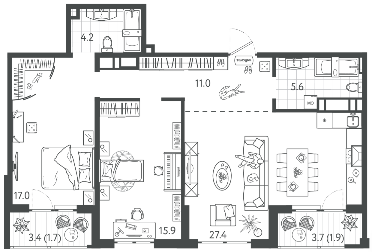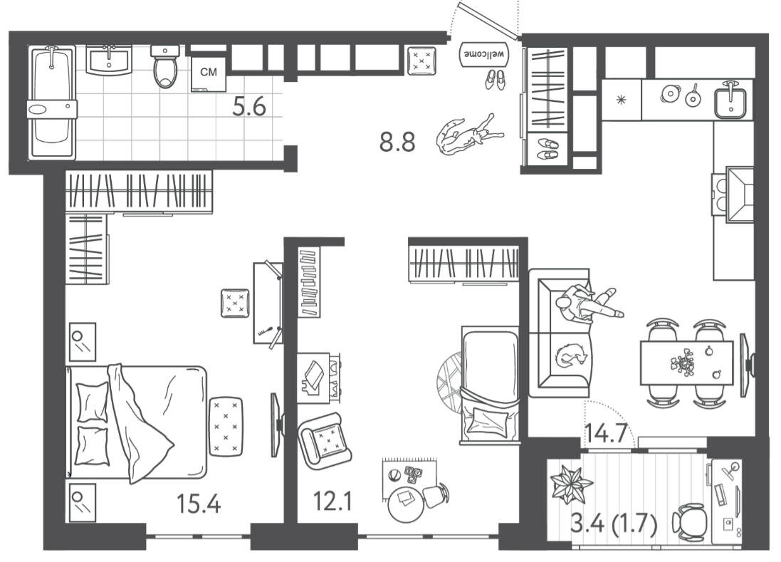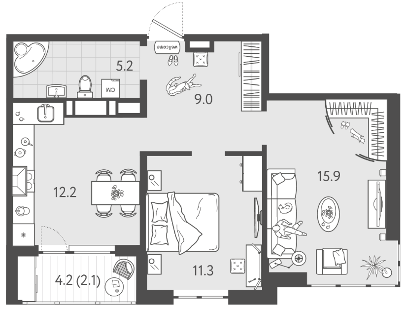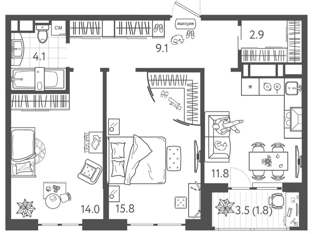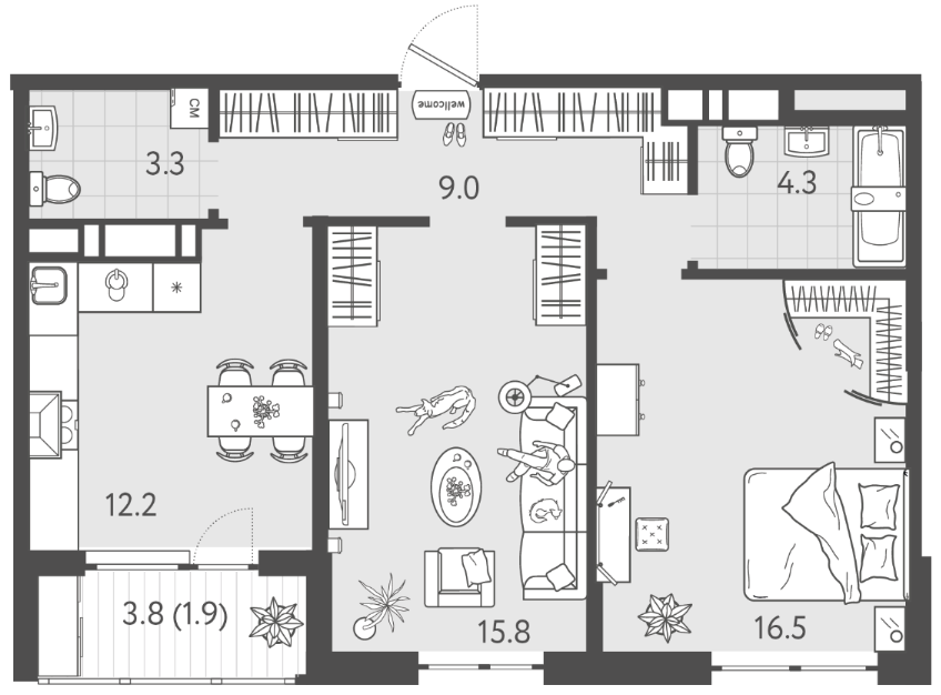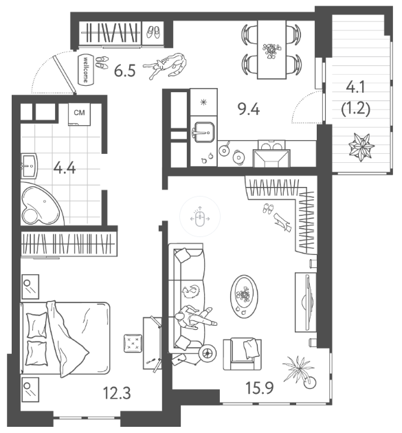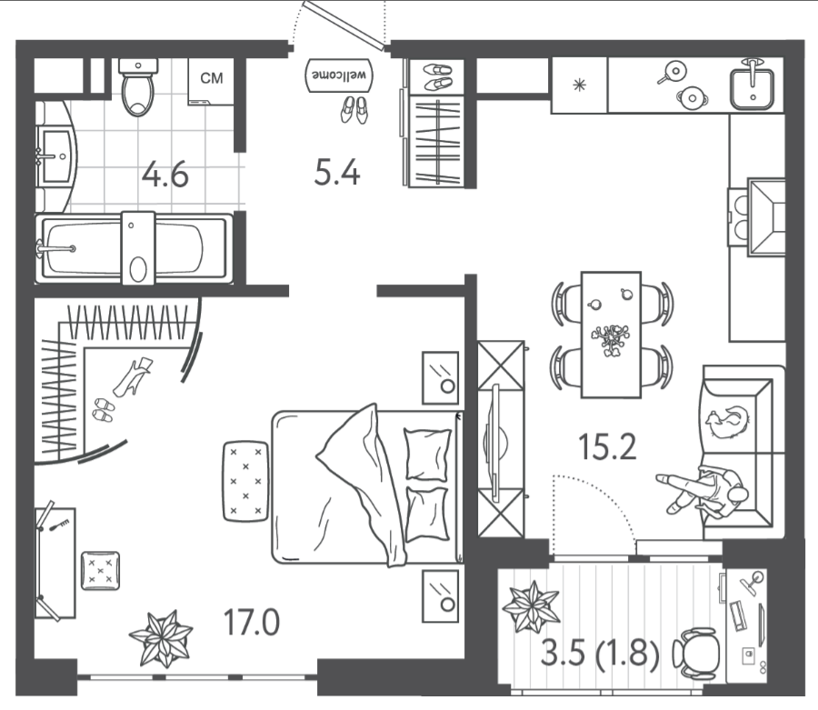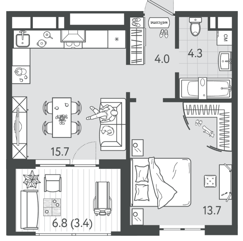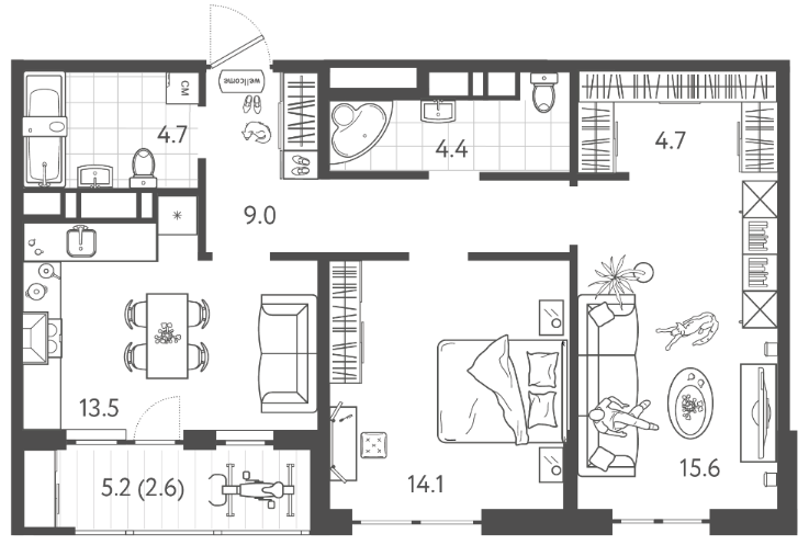 Меня завлекли планировки. Такой огромной гардеробной у меня еще не было! Теперь все мои платья будут в порядке. И сам комплекс такой светлый, стильный, дома не вплотную, есть где дышать.