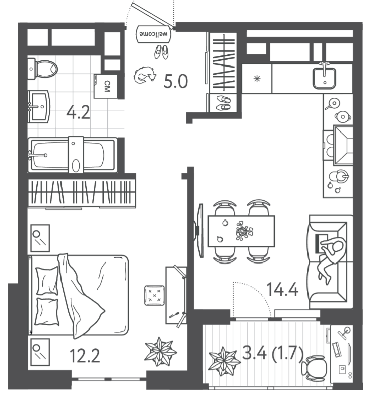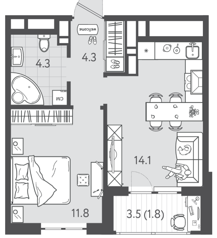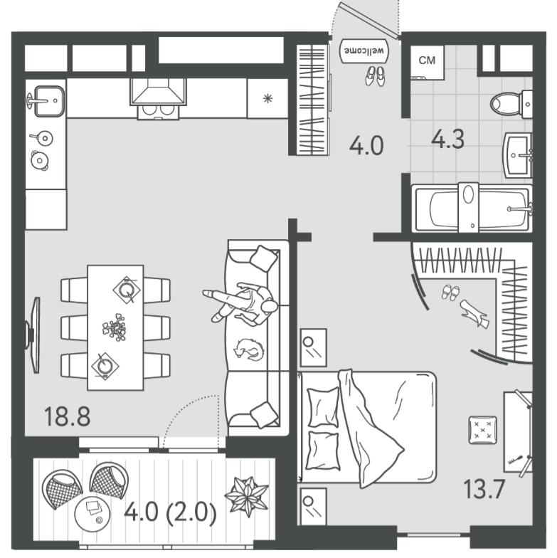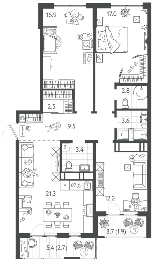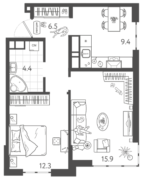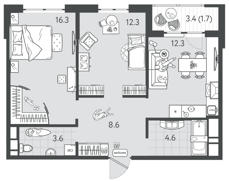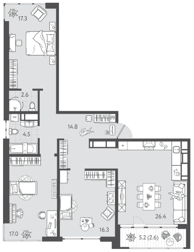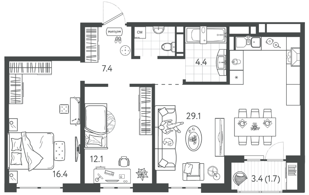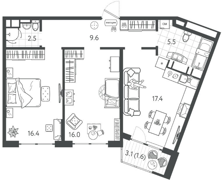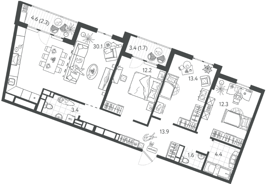 Меня завлекли планировки. Такой огромной гардеробной у меня еще не было! Теперь все мои платья будут в порядке. И сам комплекс такой светлый, стильный, дома не вплотную, есть где дышать.