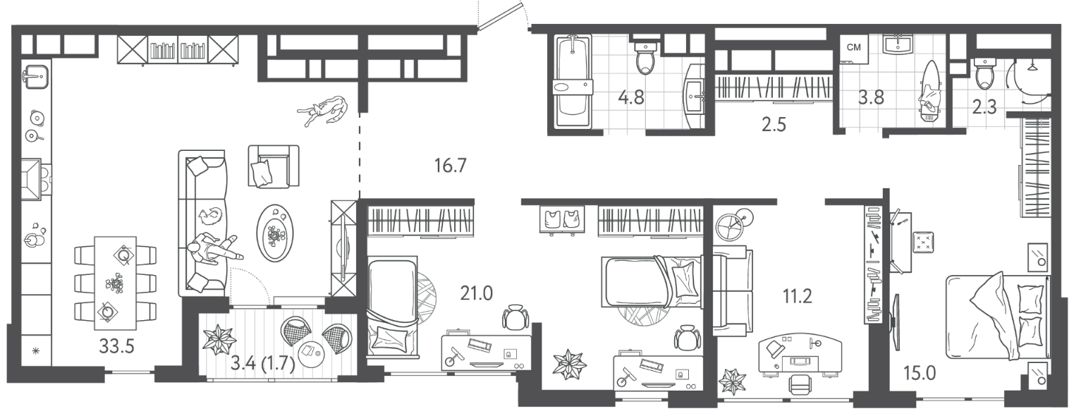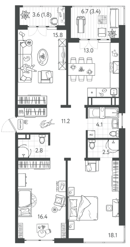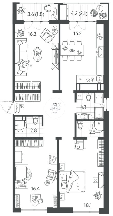 | 3 | 112.85 / 47.2 м² | от 34 983 500 руб. (310 000 руб./м²) | Планировка | |