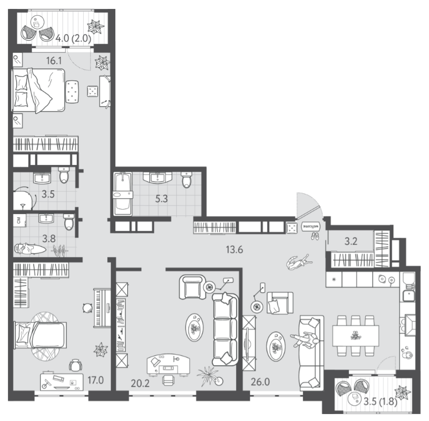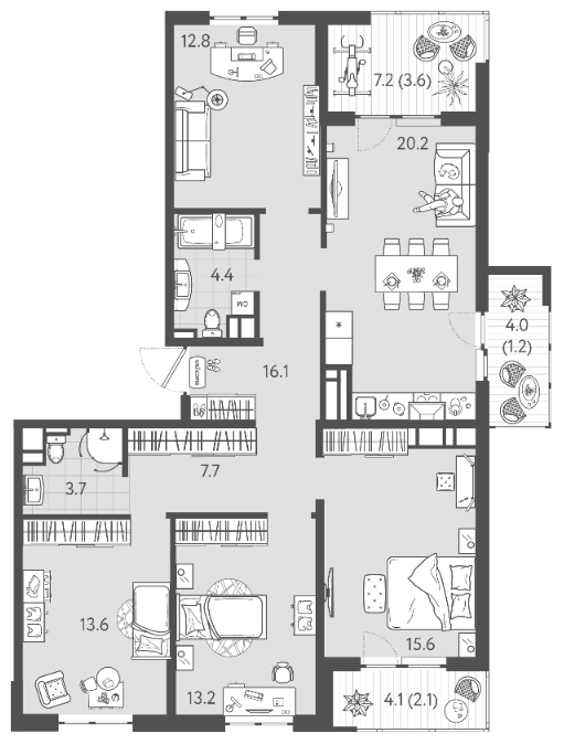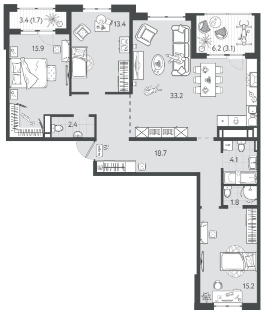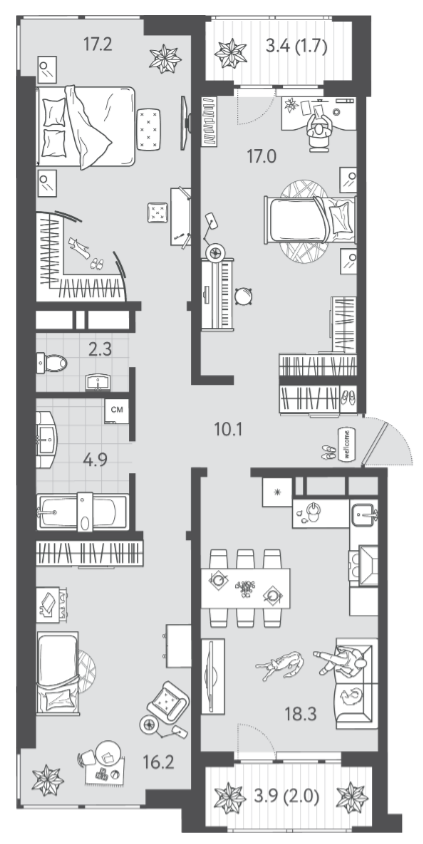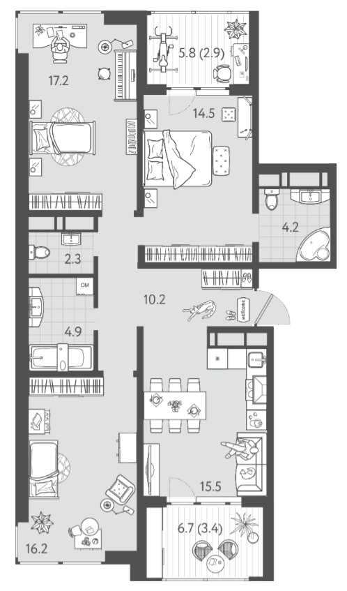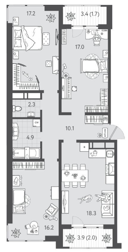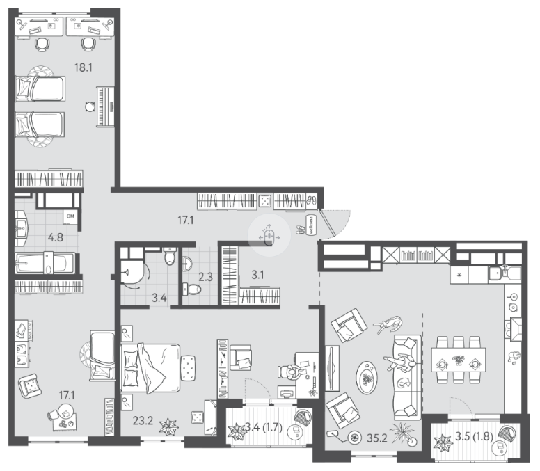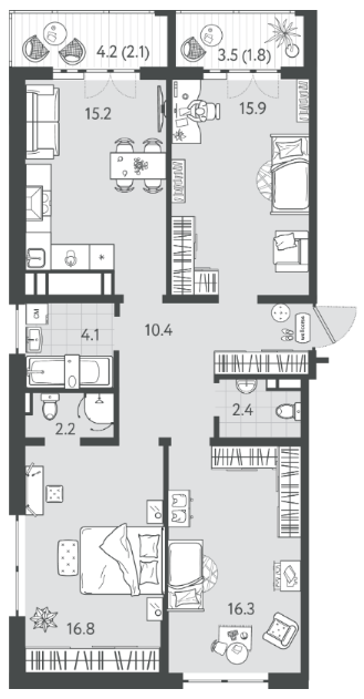 | 4 | 107.22 / 55.2 м² | от 33 238 200 руб. (310 000 руб./м²) | Планировка |