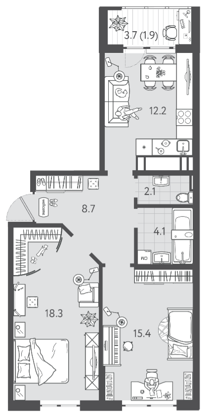 В новостройке продаются студии, евро 1-, 2-, 3-, 4- квартиры и классические планировки 1-, 2-, 3- комнатных квартир. Помещения сдаются с предчистовой отделкой, окнами ПВХ, входной металлической дверью, приборами учета воды, электроэнергии и тепла.