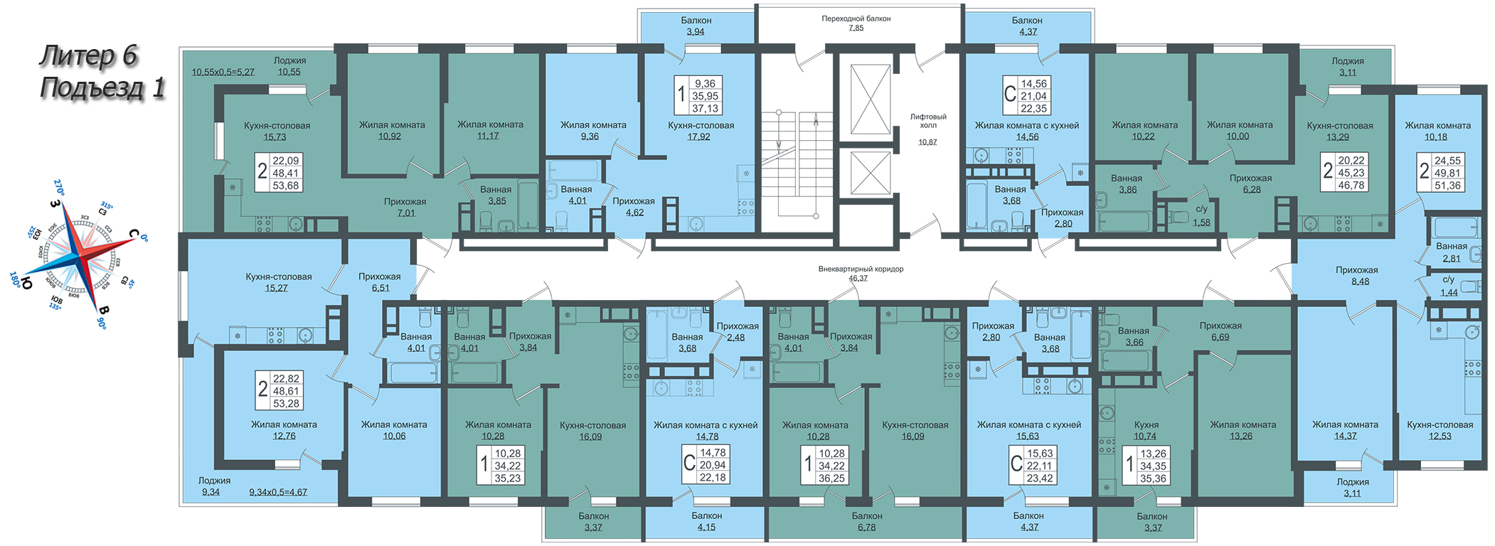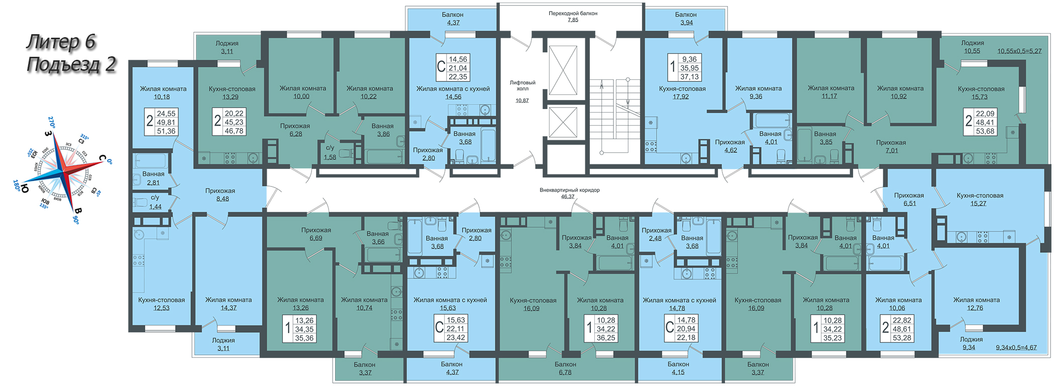 2 54.47 / 22.24 м² от 7 021 183 руб. (128 900 руб./м²) Планировка