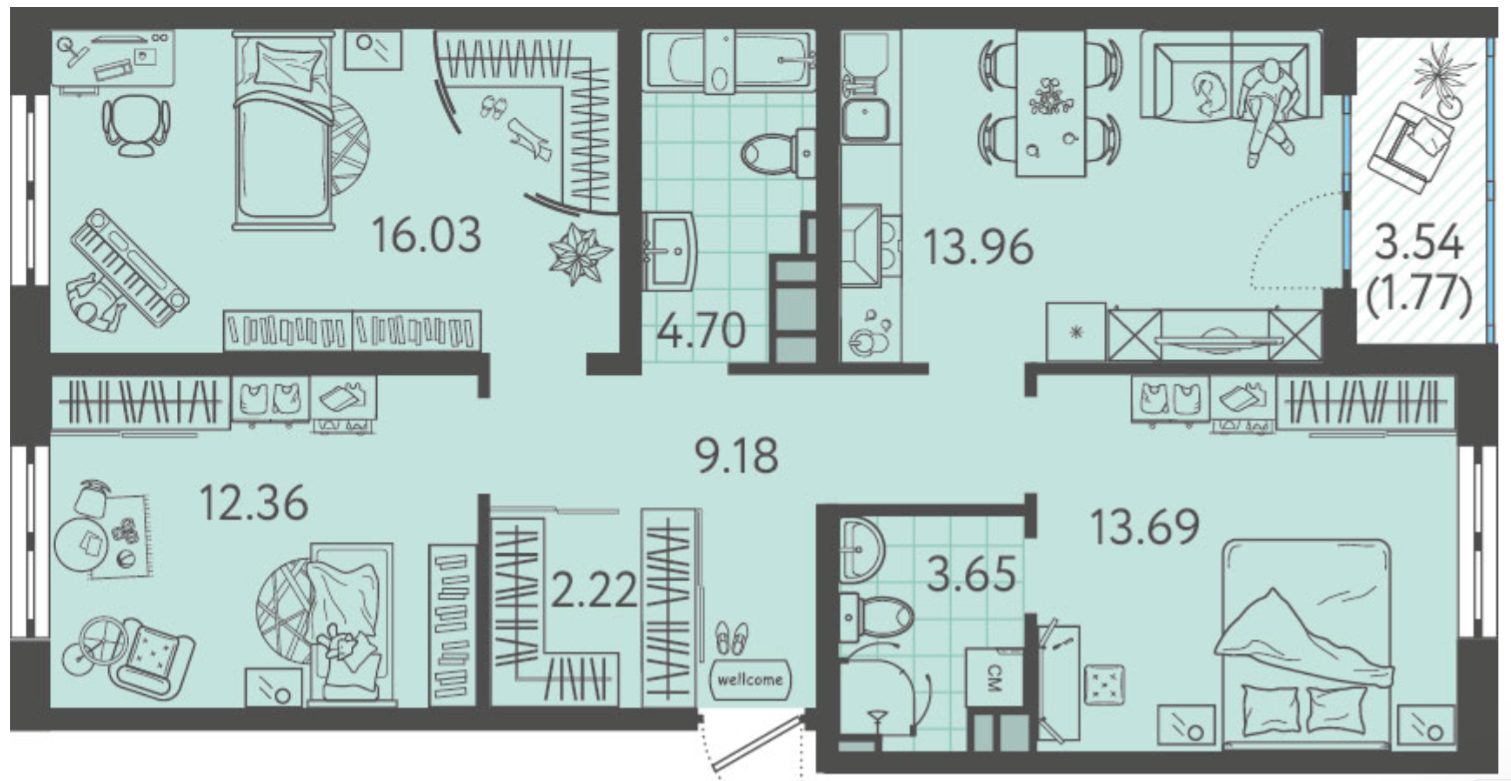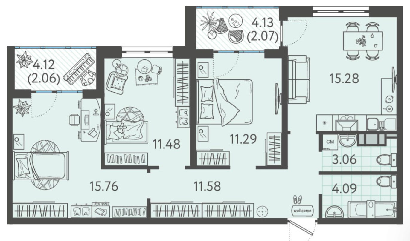 Покупатель может выбрать студию или квартиру с площадью от 21 до 83 м кв. Крупные застекленные лоджии с шириной до 150 см увеличивают полезный объем. Разнообразие планировочных решений упрощает выбор оптимального варианта.
