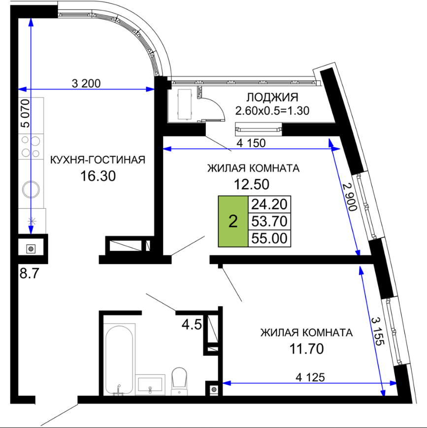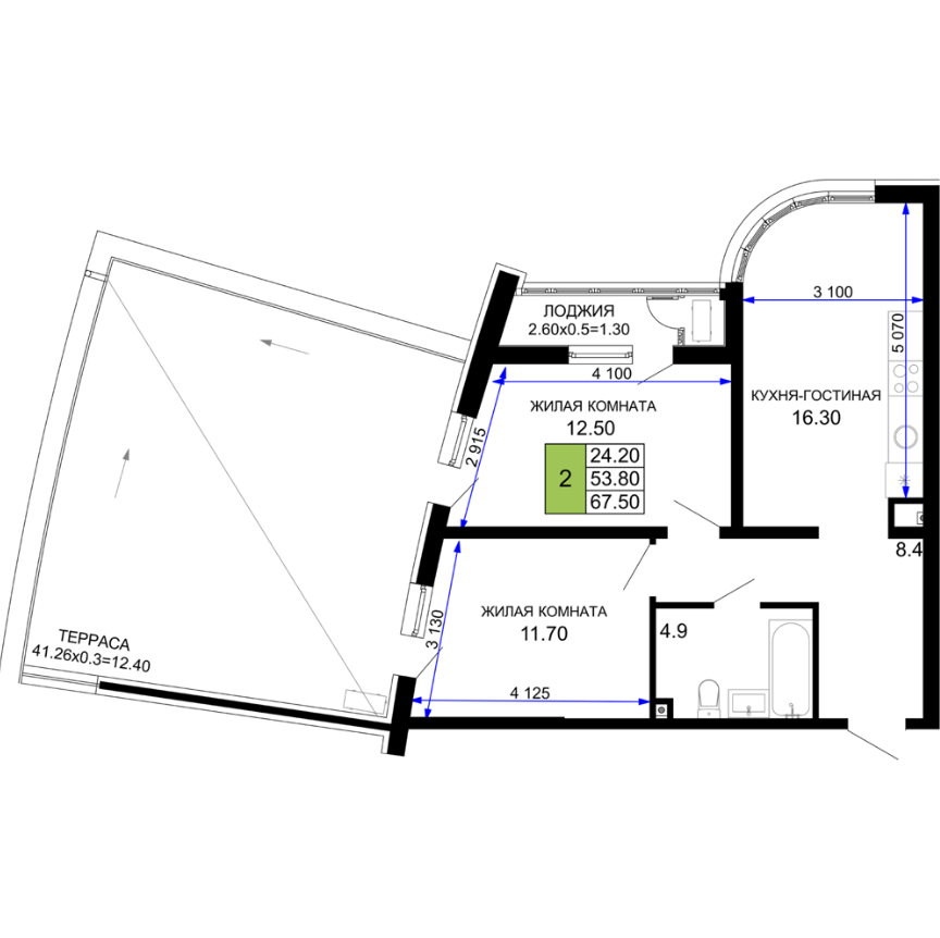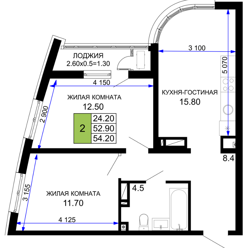 | 2 | 54.20 / 24.20 м² | от 10 840 000 руб. (200 000 руб./м²) | Планировка | |