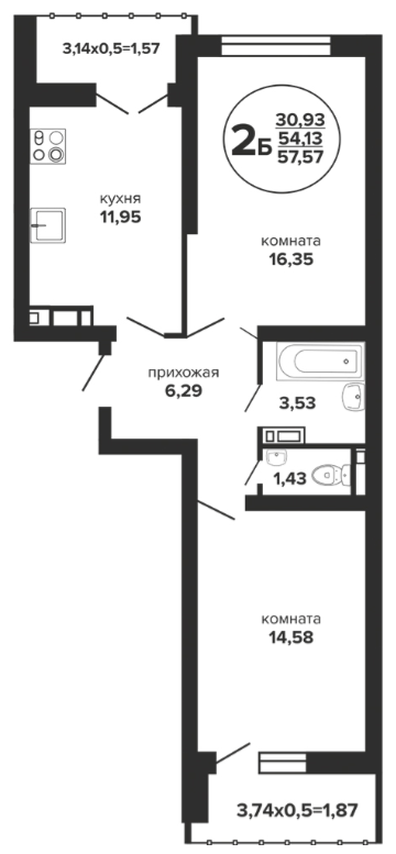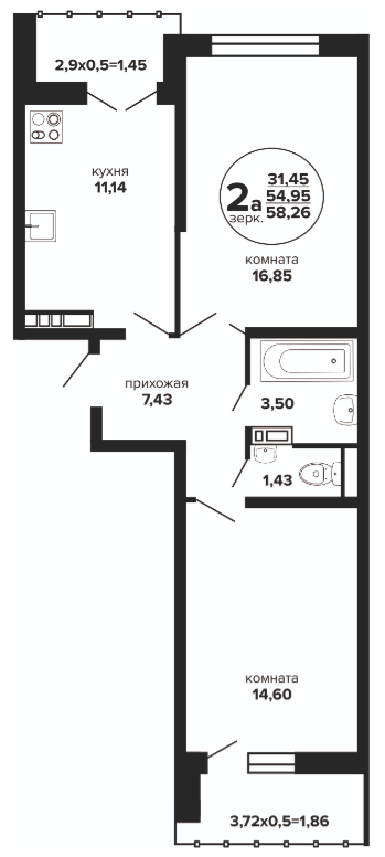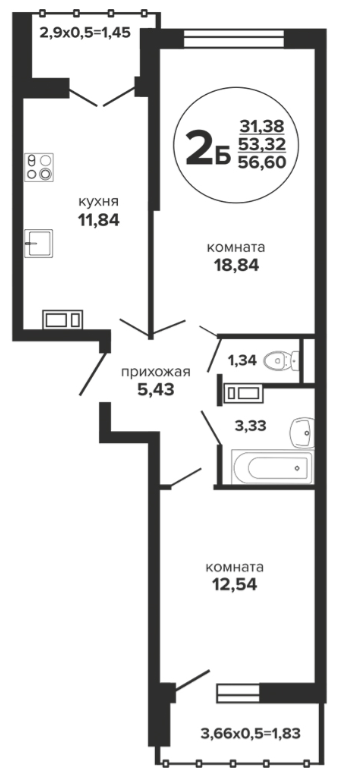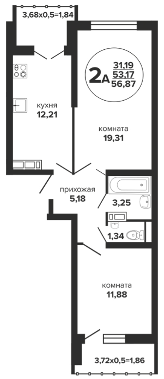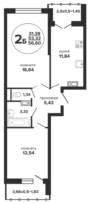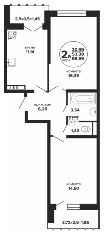 2 56.55 / 31.38 м² от 6 272 950 руб. (110 927 руб./м²) Планировка
