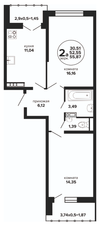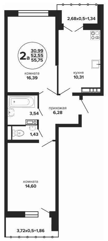 2 55.71 / 30.99 м² от 7 022 524 руб. (126 055 руб./м²) Планировка
