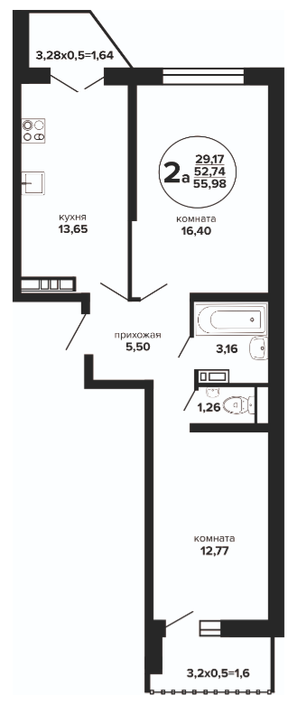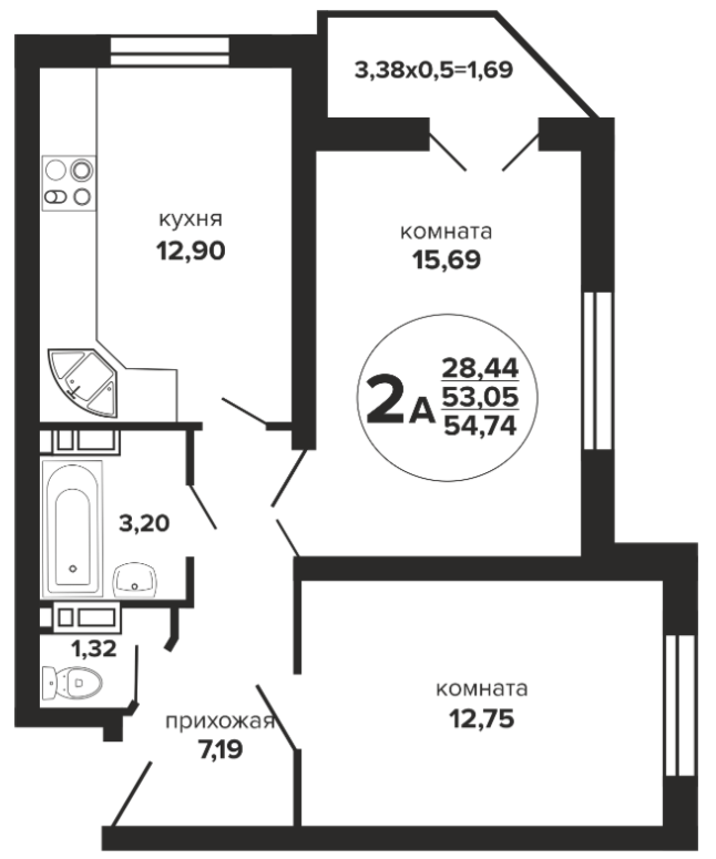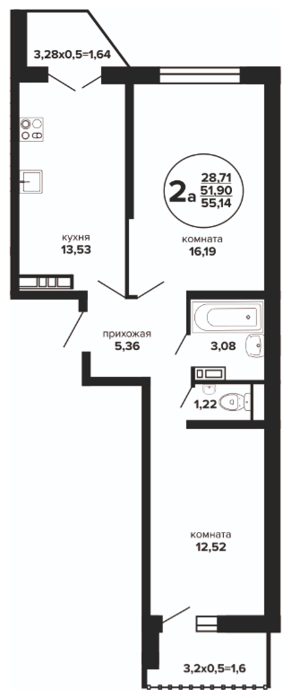 2 54.74 / 28.44 м² от 6 033 150 руб. (110 215 руб./м²) Планировка