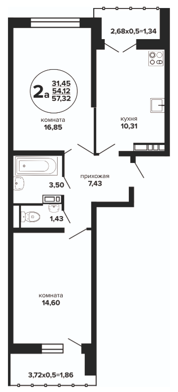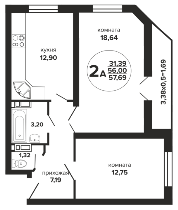 2 57.69 / 31.39 м² от 6 387 400 руб. (110 719 руб./м²) Планировка