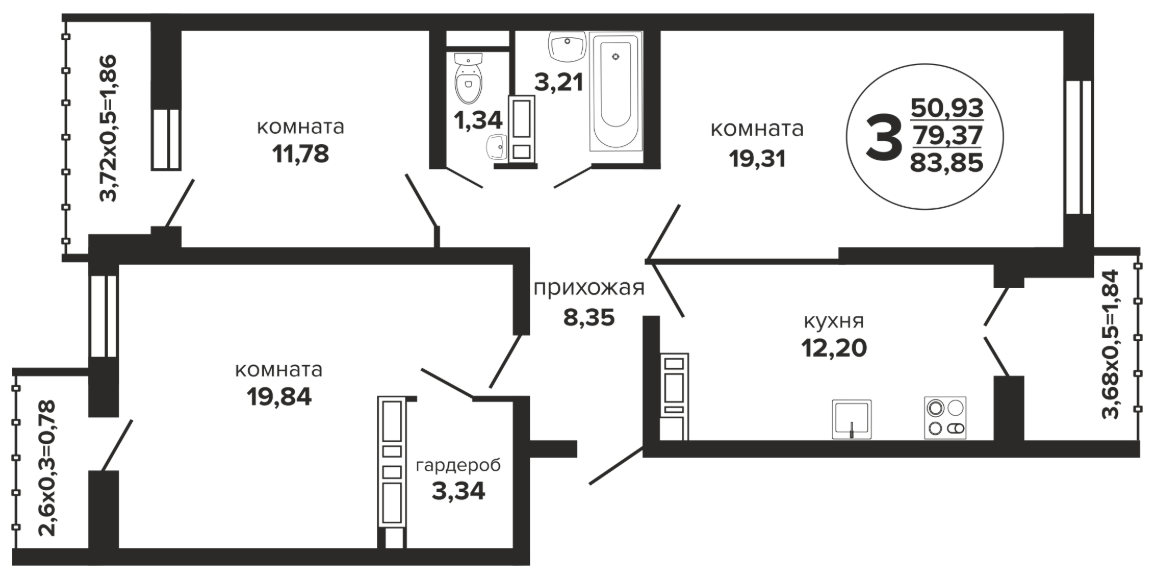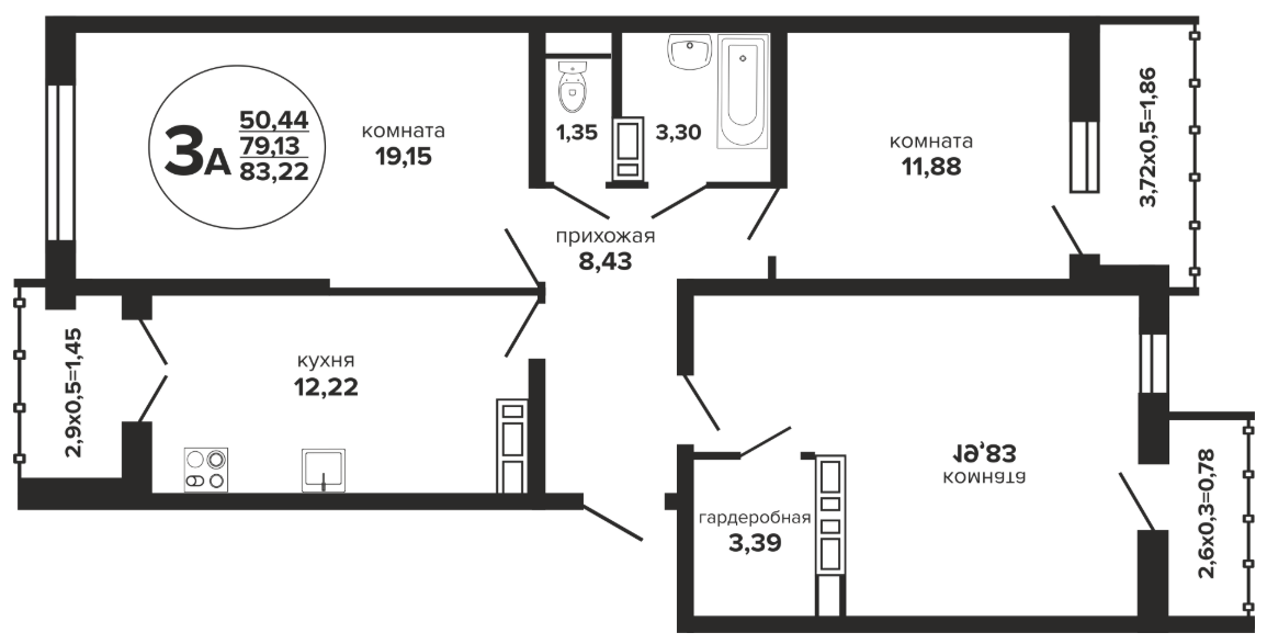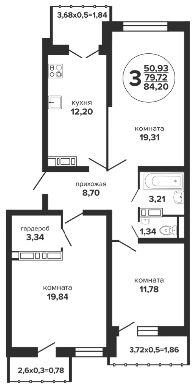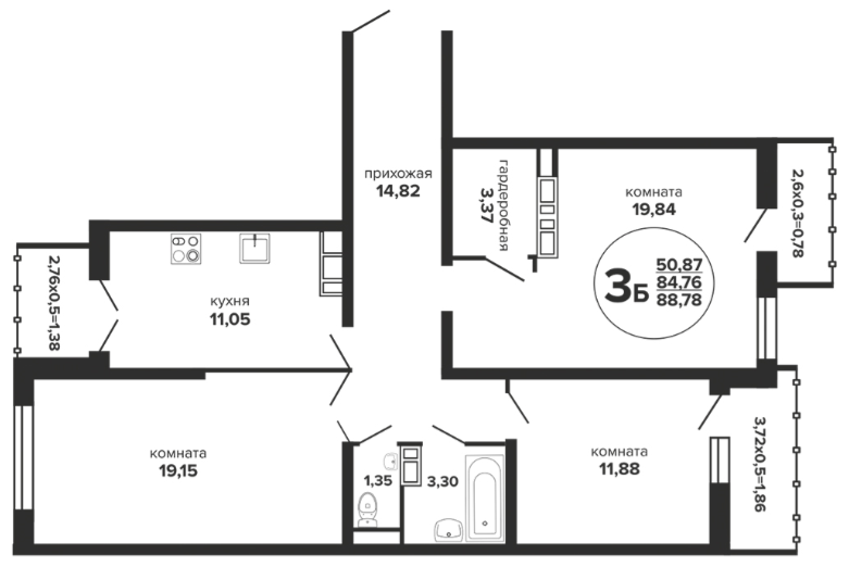 3 88.78 / 50.87 м² от 8 962 470 руб. (100 951 руб./м²) Планировка