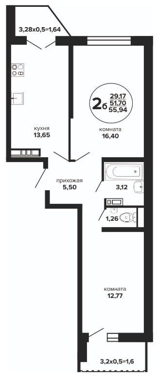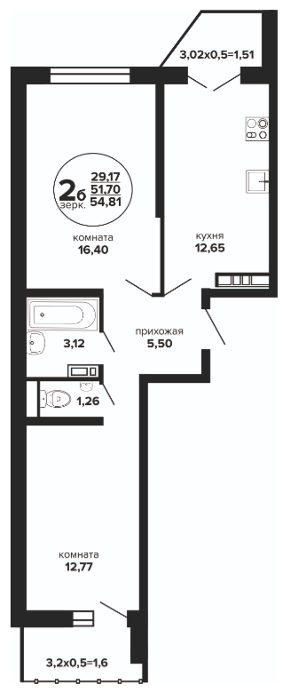 2 54.81 / 29.17 м² от 6 570 349 руб. (119 875 руб./м²) Планировка