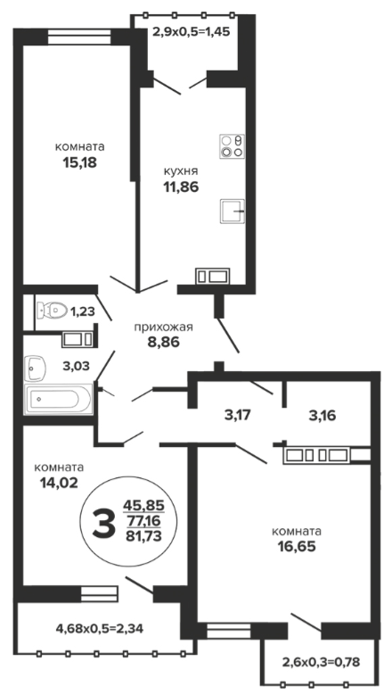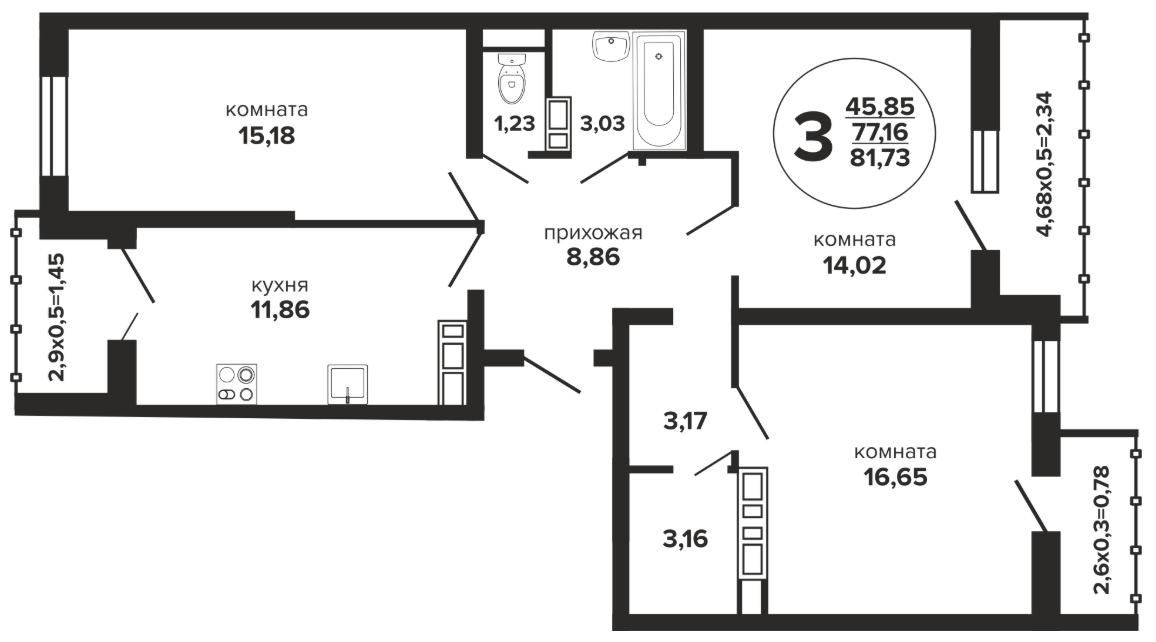 3 81.73 / 45.85 м² от 8 268 480 руб. (101 168 руб./м²) Планировка