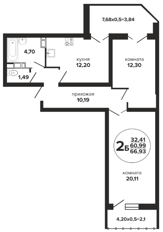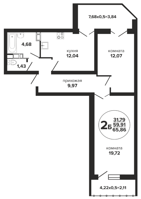 2 65.86 / 31.79 м² от 6 578 550 руб. (99 887 руб./м²) Планировка
