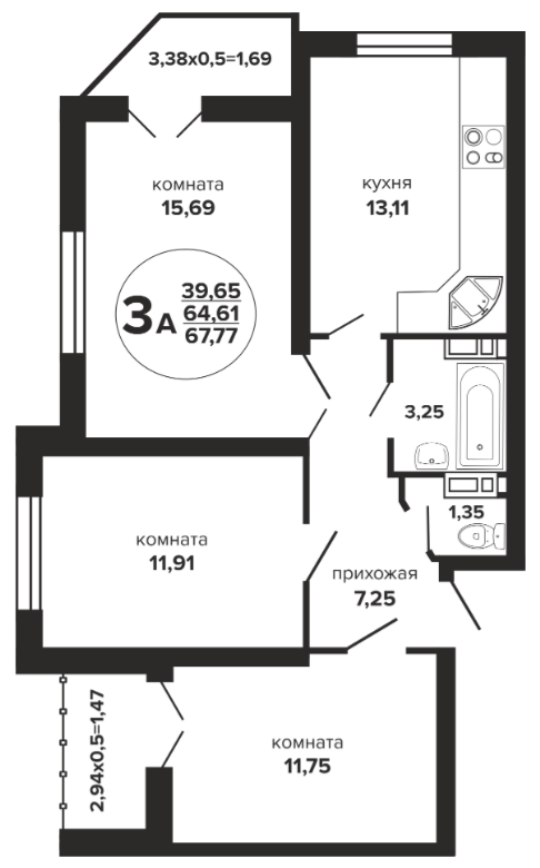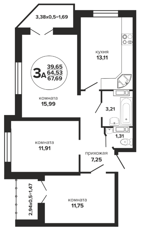 3 67.69 / 39.65 м² от 7 499 200 руб. (110 787 руб./м²) Планировка