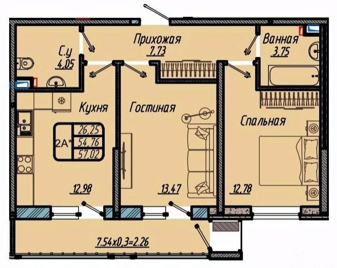 | 2 | 56.27 / 26.26 м² | от 9 565 900 руб. (170 000 руб./м²) | Планировка | |