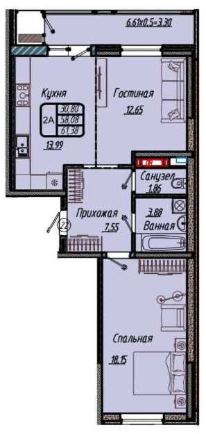 | 2 | 61.38 / 30.80 м² | от 10 434 600 руб. (170 000 руб./м²) | Планировка | |