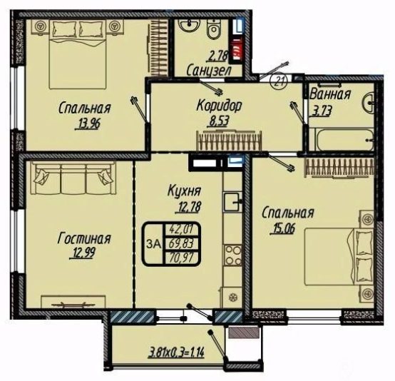 | 3 | 70.97 / 42.01 м² | от 12 064 900 руб. (170 000 руб./м²) | Планировка | |